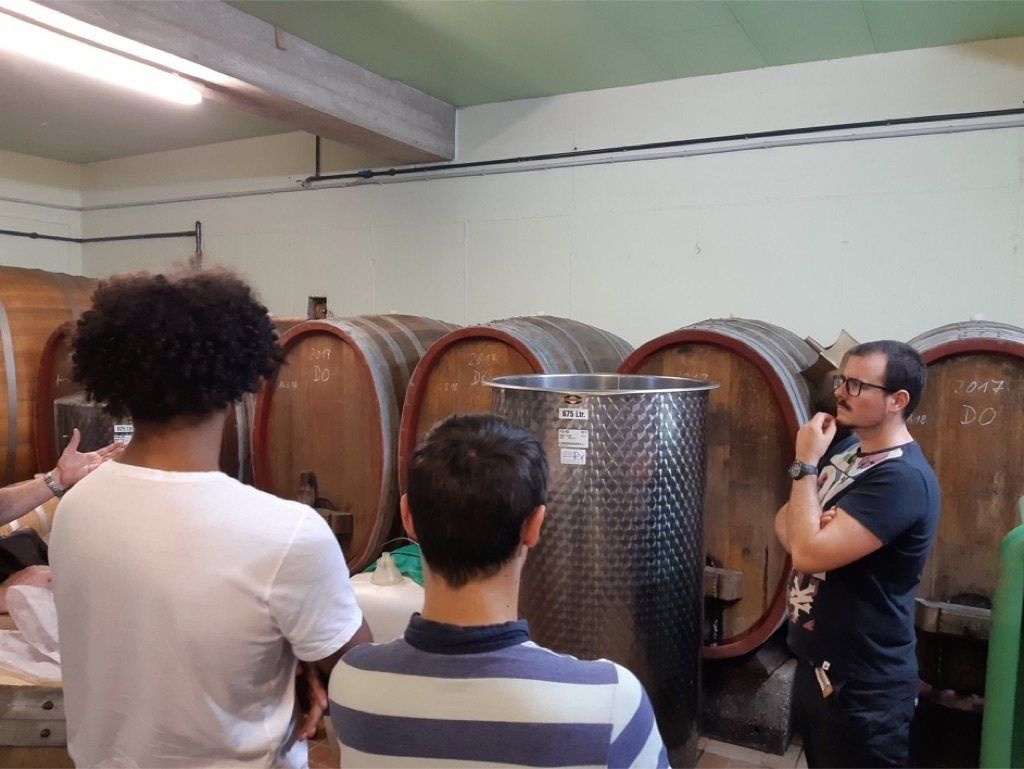 Während der Führung erkundete der Kurs verschiedene Räume des Weingutes, angefangen in der Kelterei, indem die Trauben erstmalig gepresst werden, über den Weinkeller, den Abfüllraum, den Lagerraum, bis hin zum Etikettier Raum. Dadurch wurde der Weg von der Traube bis zum Wein erlebbar und den Schülern anschaulich nahegebracht. Anschließend bekam die Besuchergruppe einen Einblick in die Gerätehalle, in welcher sich verschiedenste Arbeitsgeräte wie zum Beispiel Fräse, Grubber, Mulcher und Entlauber befinden, die die Arbeit in den Weinbergen erleichtern.