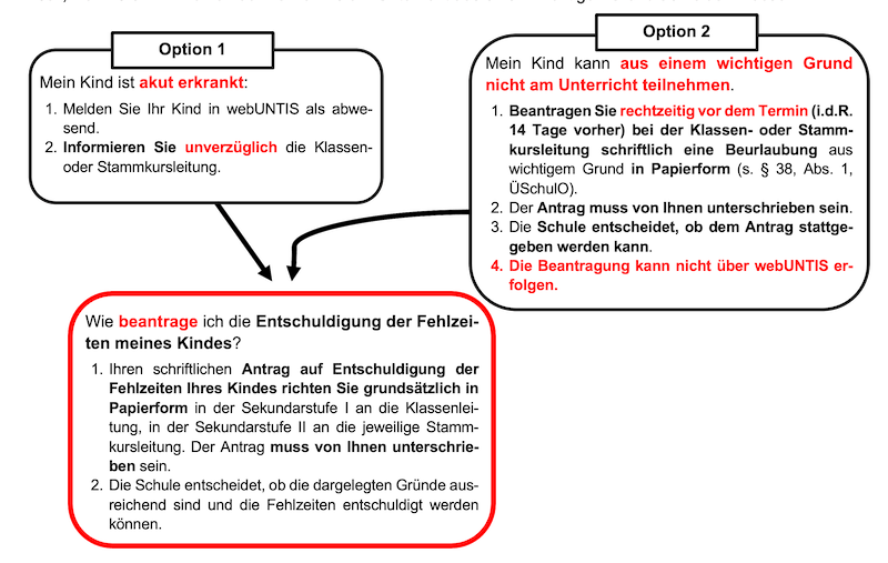 Aufgrund aktueller Nachfragen stellen wir Ihren nachstehend eine Übersicht zur Verfügung, die Ihnen helfen soll, wenn Sie Ihr Kind von der Teilnahme am Unterricht aus einem wichtigen Grund abmelden müssen.